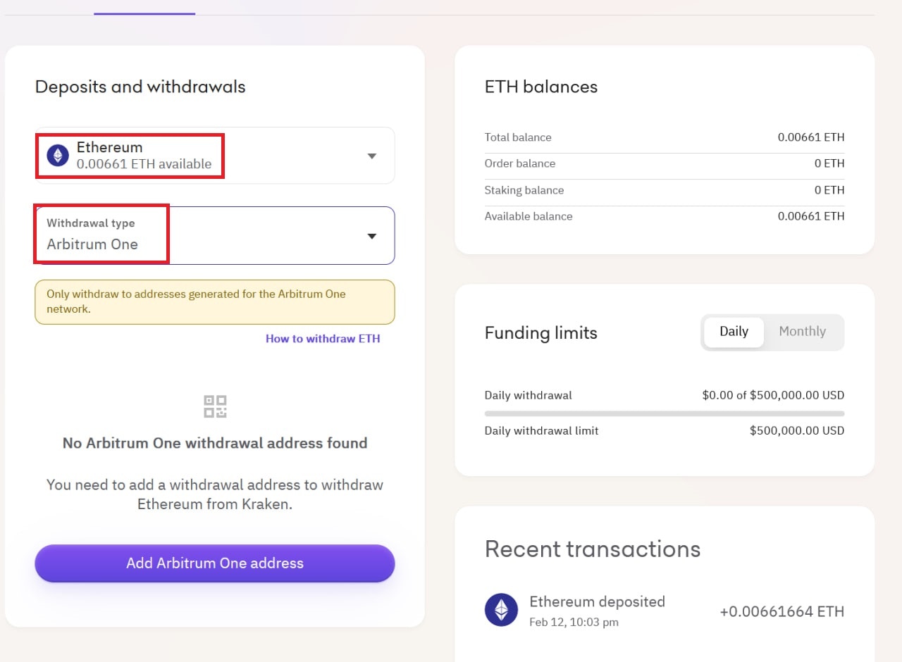 - Go to “Deposits and Withdrawals,” select “Ethereum,” and select “Arbitrum One” as your withdrawal type. Then, click “Add Arbitrum One Address”