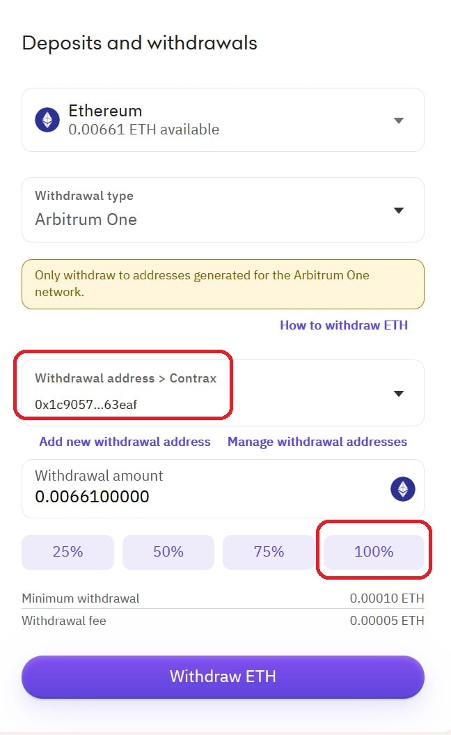 - You will not be able to select “Contrax” as your withdrawal address. You can then type in your amount to withdraw or the percentage you want. You can click 100% if you want to withdraw all. Then, click “Withdraw ETH.”