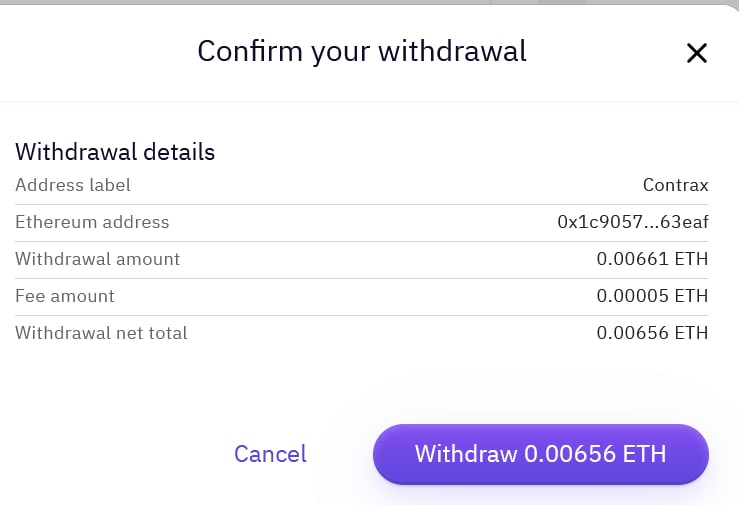 - Confirm, and that’s it! Your ETH will be sent to your Contrax wallet. Give it about a minute, and then check your dashboard. Be sure to log into Contrax with the same account you copied the address from. You will see your funds on the dashboard.